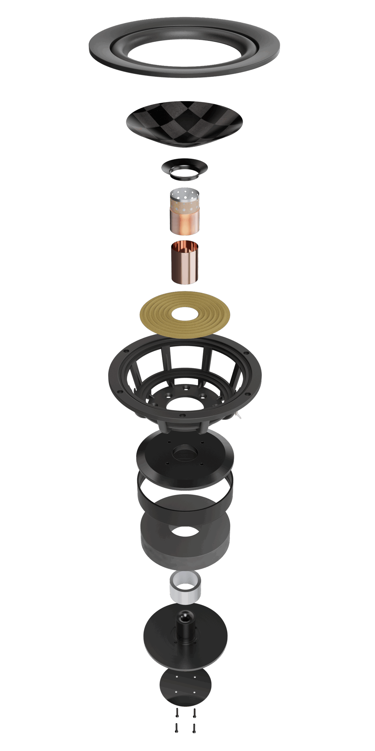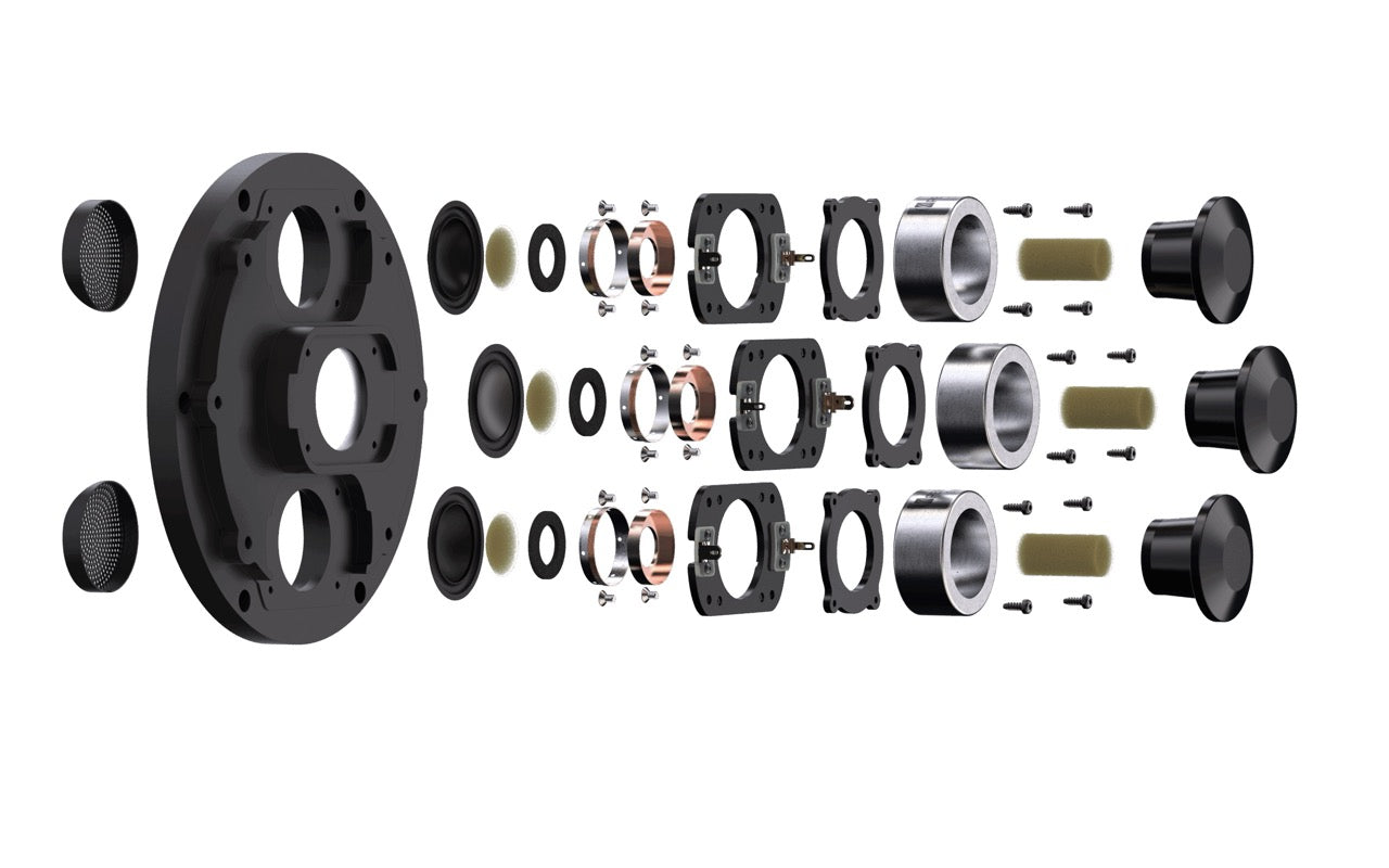 Vier Tieftöner mit TexTreme Thin Ply Carbon Diaphragmen übernehmen den Mittel- und Tieftonbereich. Dank neu entwickelter Schwingspulen, optimierter Magnetstrukturen und zusätzlicher Kühlung erreichen sie größere lineare Auslenkungen, geringere Verzerrungen und eine beeindruckende dynamische Bandbreite.